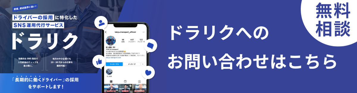 そこで、SNSを活用することにより、求職者への入社前後のギャップを極限まで減らし、長期的に働く「辞めないドライバー」の採用をサポートするのが、産廃・運送業界に強いSNS運用代行サービスの「ドラリク」です。